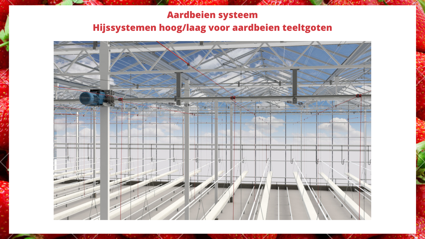 Voor meer informatie over hoog/laag teeltgoot hijssysteem voor aardbeien, bezoek onze website: Aardbeien systeem - Aandrijfsystemen voor hijsen - Aandrijfsystemen voor glazen kassen - Aandrijfsystemen | De Gier Drive Systems