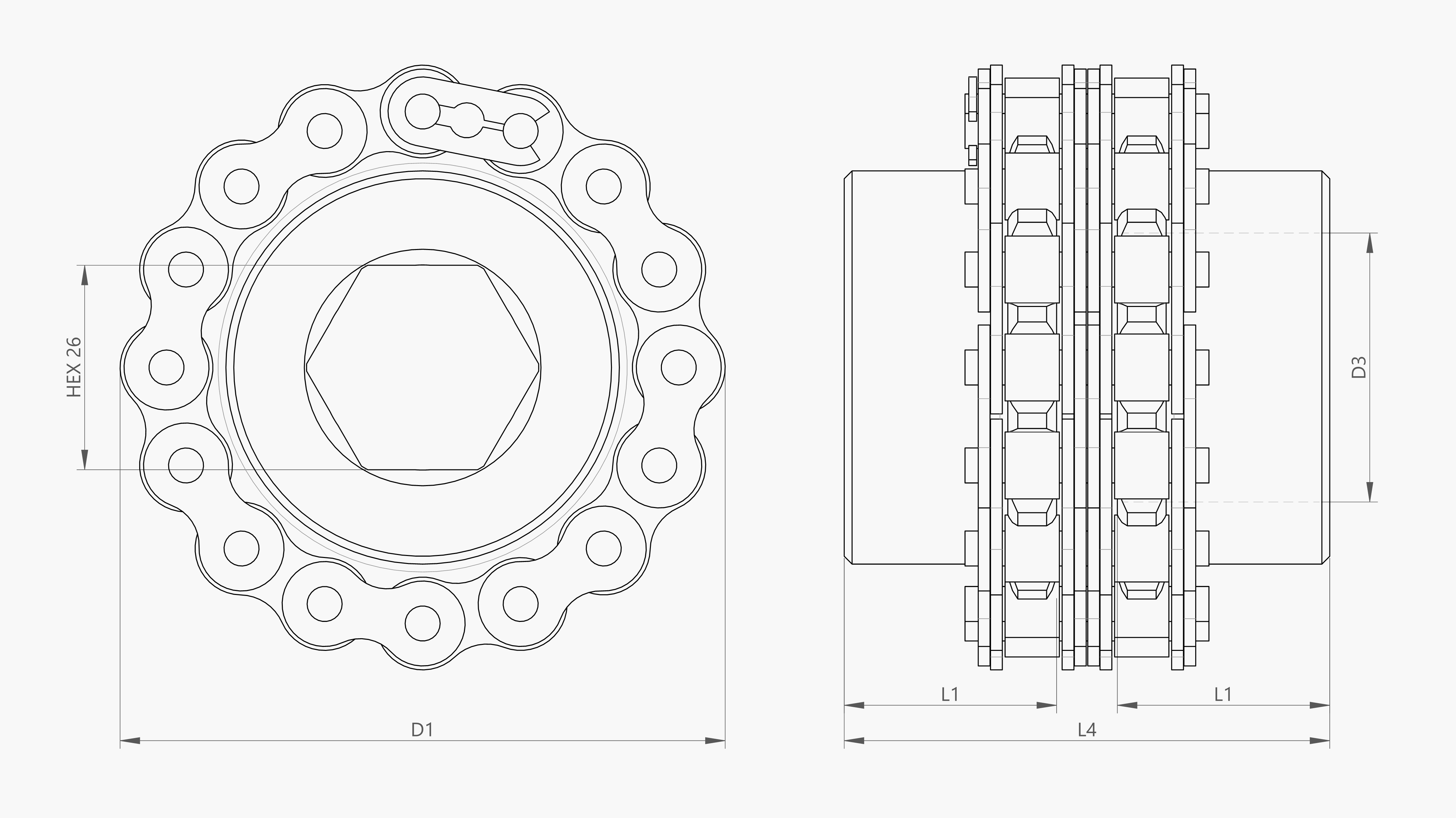 | Artikel | Omschrijving | Tmax [Nm] | Z [tanden] | D1 [mm] | D3 [mm] | L1 [mm] | L4 [mm] | m [kg] |