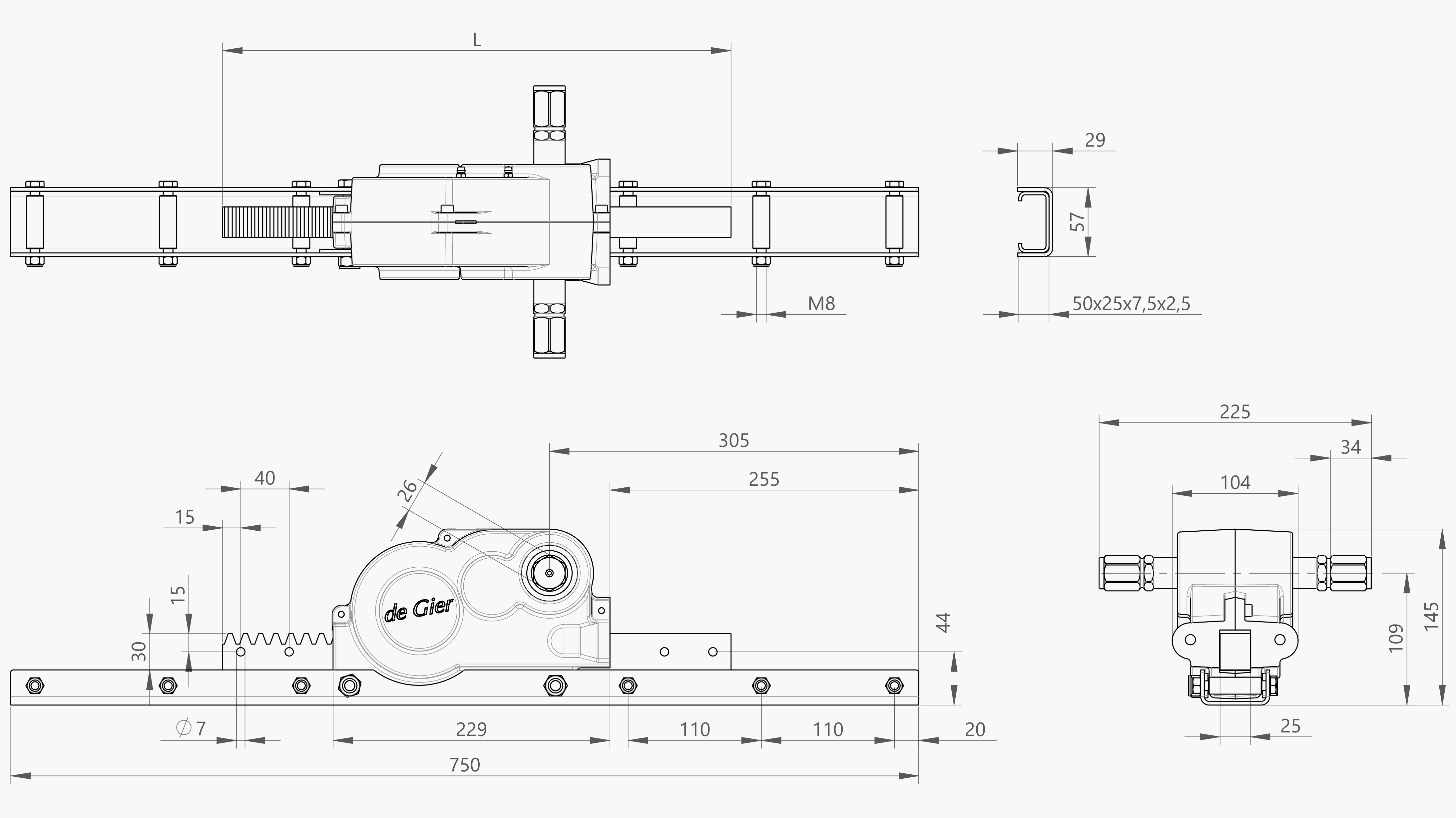 | Artikel | Omschrijving | F [N] | T [Nm] | i [-] | L [mm] | S [mm] | s [mm/rpm] | n [rpm] | m [kg] |