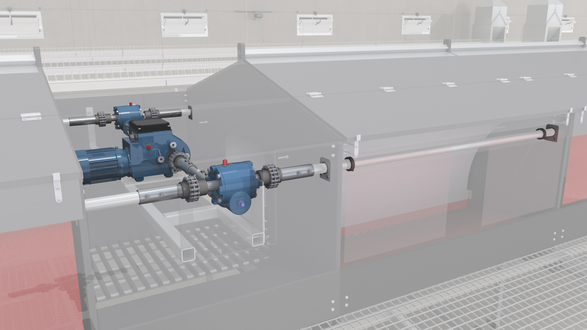 Contact opnemenHet uitdrijven uit legnesten geschiedt door een centrale aandrijfbuis boven elk legnest. Op de assen zijn staalkabels gewikkeld, die verbonden zijn met de vloeren van het legnesten. In het midden van de as geplaatste motorreductoren drijven de assen aan. De rotatie van de assen wikkelt de kabel om de assen en bedient de vloeren van de legnesten.