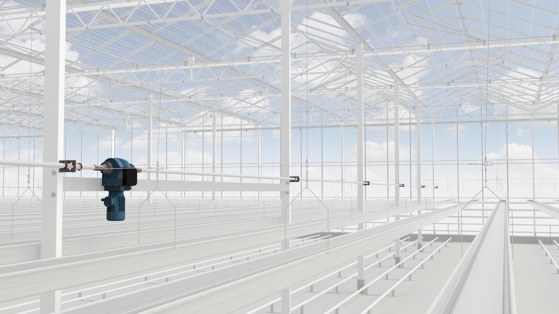 Om tot een optimale benutting van het teeltoppervlak en een optimale aardbeienteelt en optimale arbeidsomstandigheden bij het oogsten te komen zijn beweegbare teeltgoten de oplossing. Voor de gewenste groei en productie hangen de teeltgoten op de ideale afstand van elkaar. Bij het oogsten wordt tussen de teeltgoten ruimte gecreëerd voor de oogstmedewerkers en oogstkarren. Bij het Swing- of schommelsysteem gebeurd dit door om en om bij de helft van de teeltgoten de trekkabels of te laten vieren of aan te trekken richting de centraal geplaatste motorreductor en wikkelas. Deze wikkelas loopt bij dit systeem in gootrichting. Bij het hoog / laag systeem wordt om en om de helft van de teeltgoten met kabels omhoog en de andere helft omlaag bewogen. Wanneer de teeltgoten laag hangen kan er op optimale hoogte worden geoogst. Het hoog / laag systeem wordt aangedreven door wormwielreductiekasten en snellopende motorreductoren die wikkelassen gemonteerd in tralierichting aandrijven. Wij bieden u graag onze kennis en expertise aan om tot een goed aandrijfsysteem voor aardbeienteeltgoten komen.